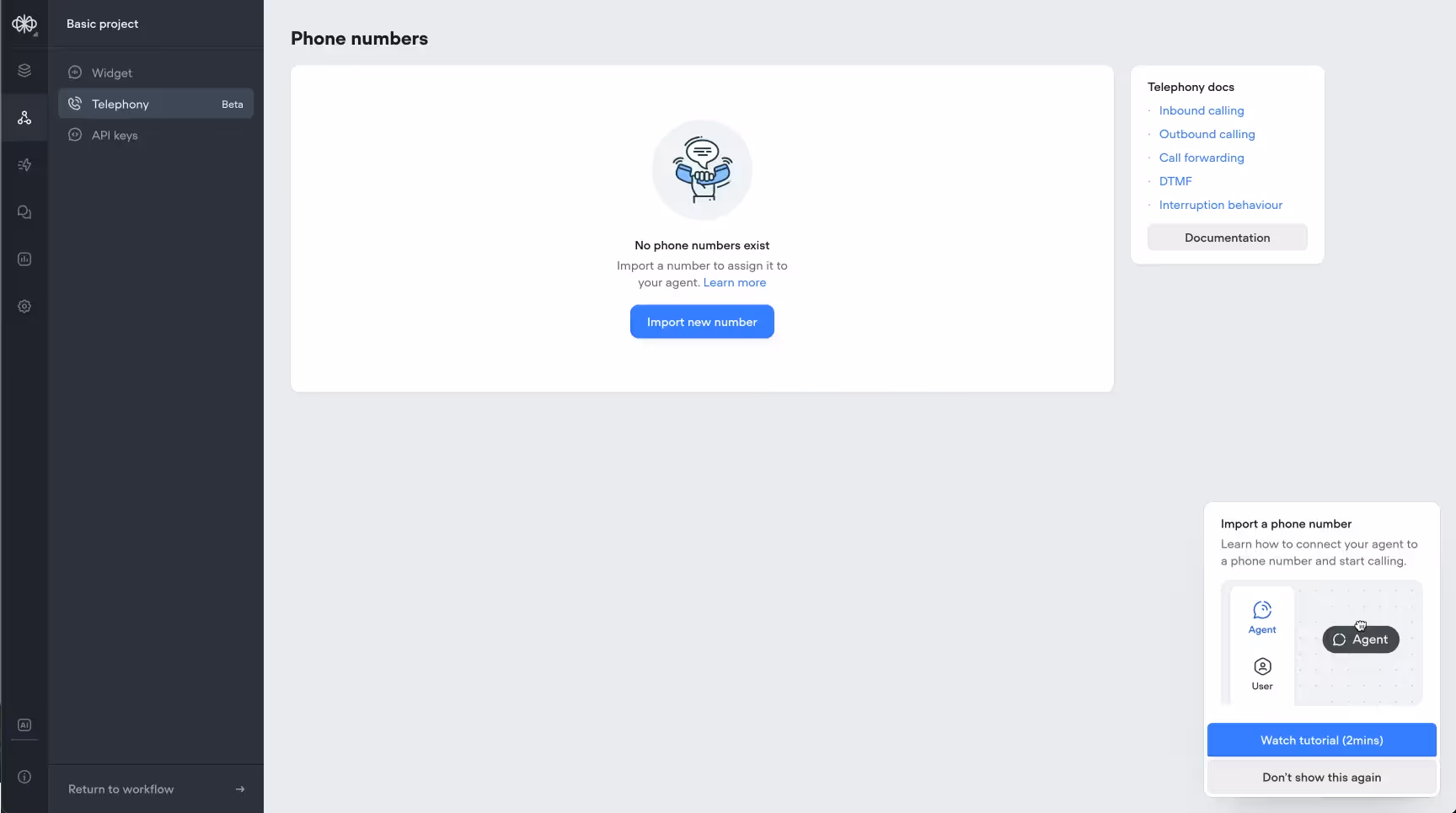 If you plan to deploy your voice agent to be reachable via a phone number, you need to connect a number. You can also build an AI voice chat for other channels such as Discord, WhatsApp, and more.