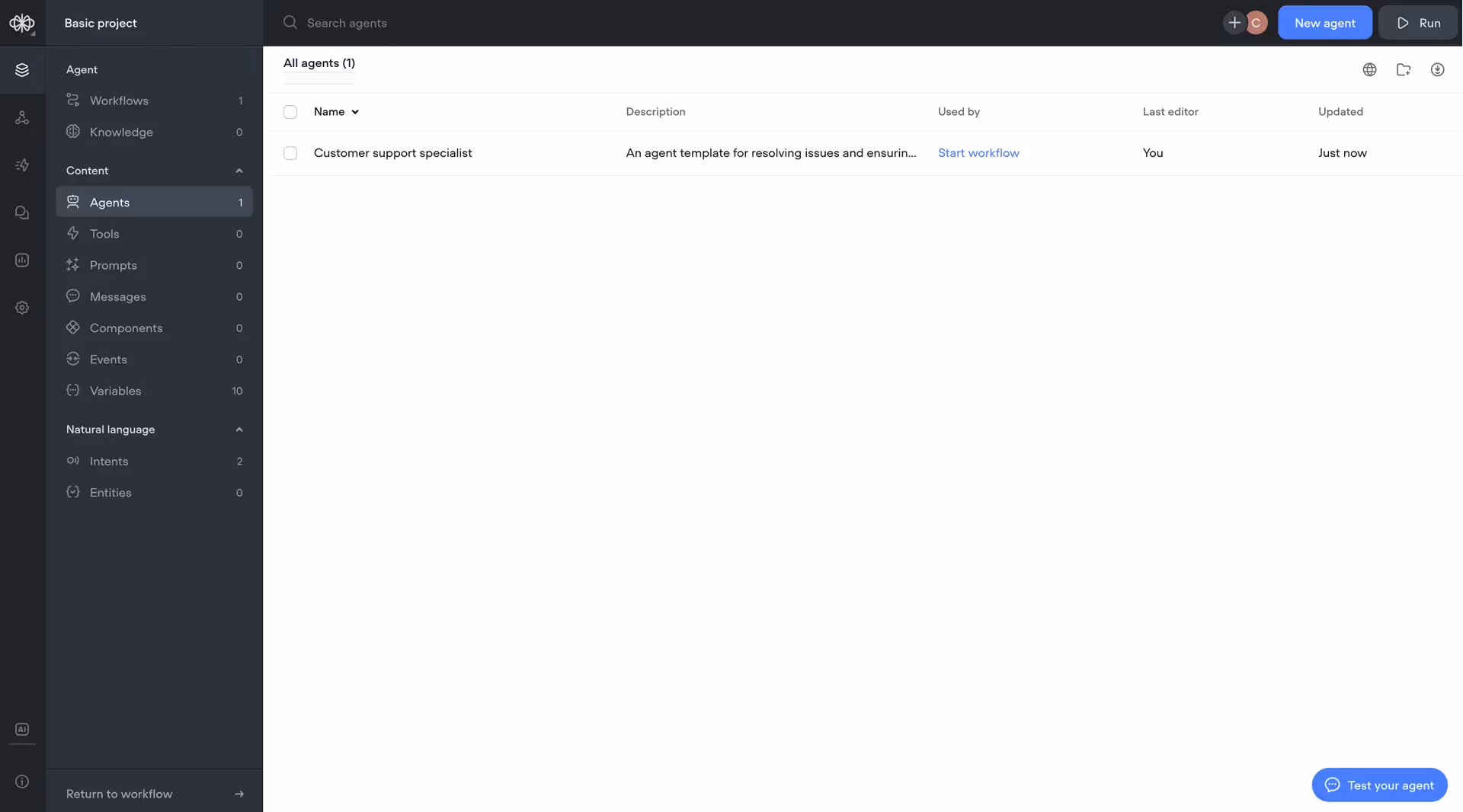 - You will immediately land on the canvas display, which is where you build your agent using a visual flow builder