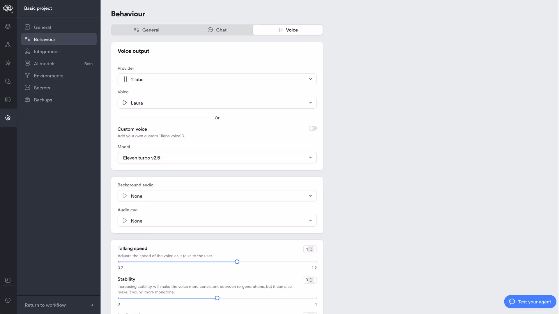 After selecting voice in Behavior settings, you get options for configuring the voice agent.