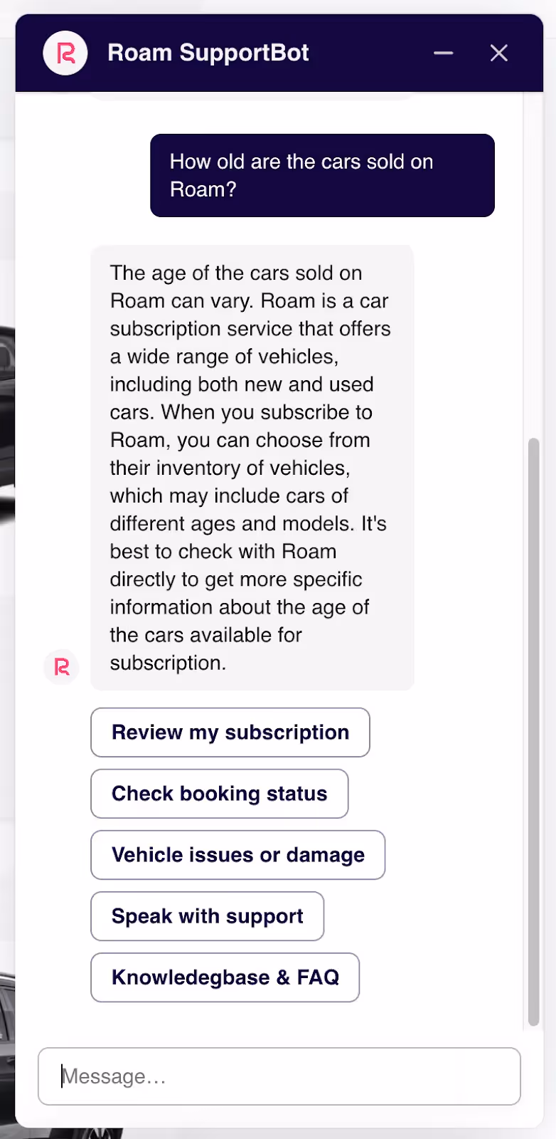 The Roam SupportBot serves as the company’s chatbot for visitors. Powered by Voiceflow, the Roam SupportBot offers a nice hybrid of menu buttons and a text box, offering you a speedy way to ask any question that comes to mind. Furthermore, Roam’s chatbot comes with personalized assistance, automotive expertise, and integration with other Roam departments.