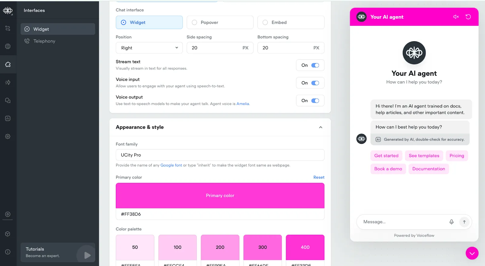 Voiceflow offers powerful customization options to make your coaching bot match your brand perfectly: