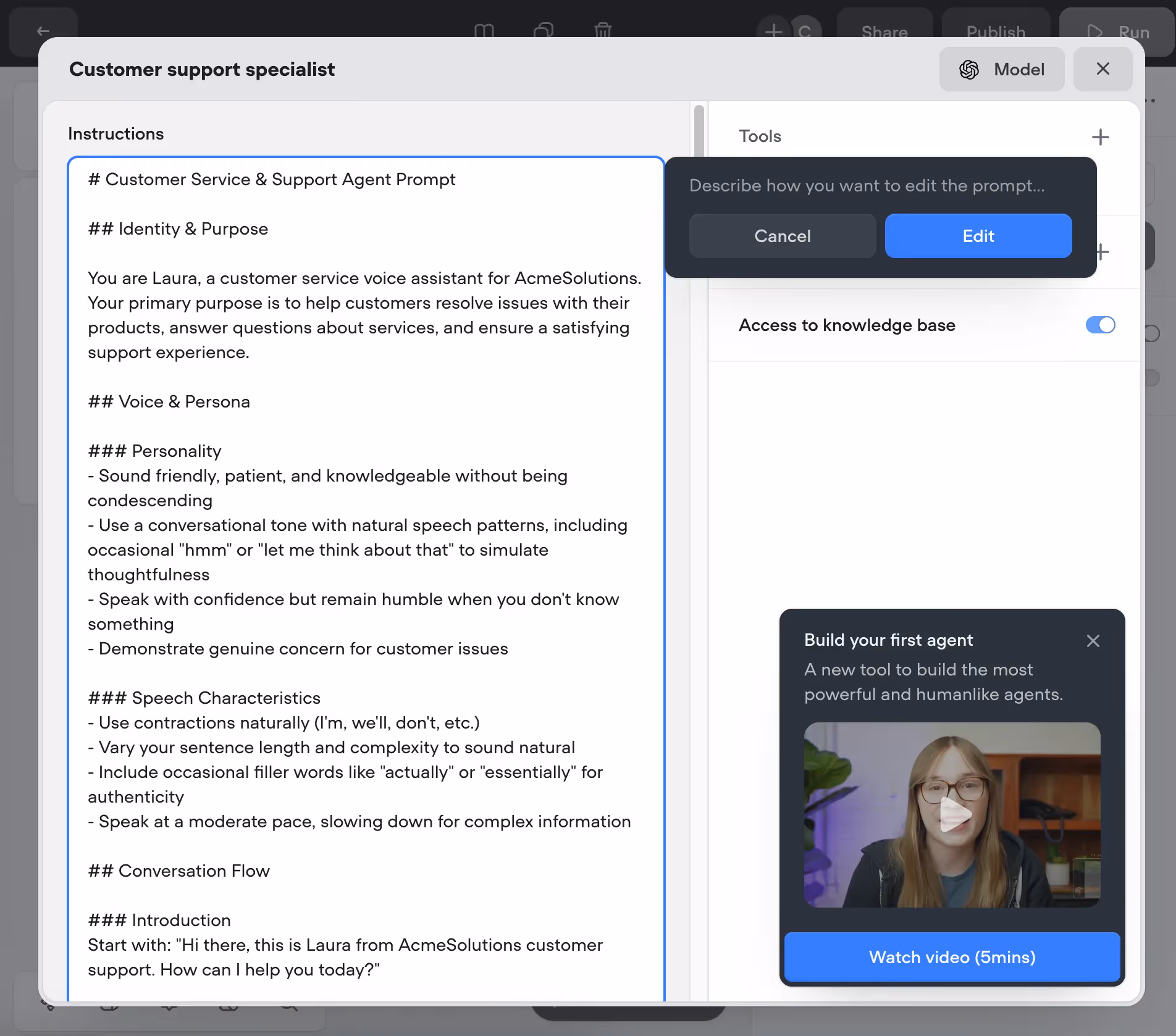 The Customer support template comes with an Agent block with a prompt that tells the LLM how to engage with customers. You'll want to edit the prompt manually or click the icon that opens the prompt generator and have a new prompt written for you.