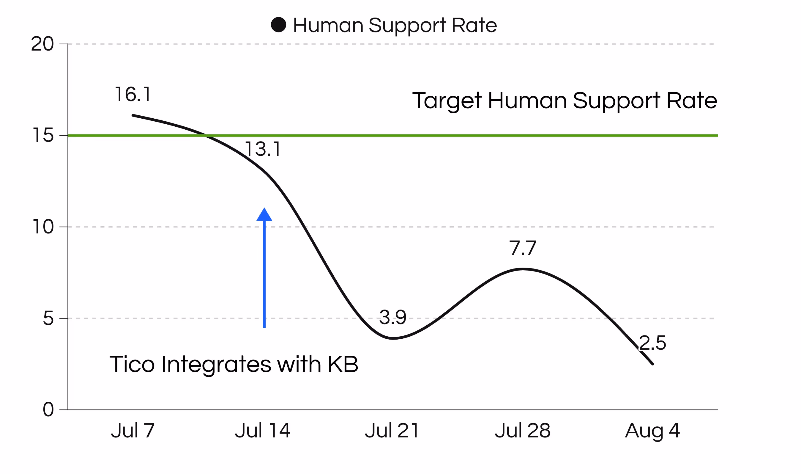 From an overwhelming flow of inquiries, Tico efficiently managed user interactions, leading to a sharp decrease in the need for live or human support.