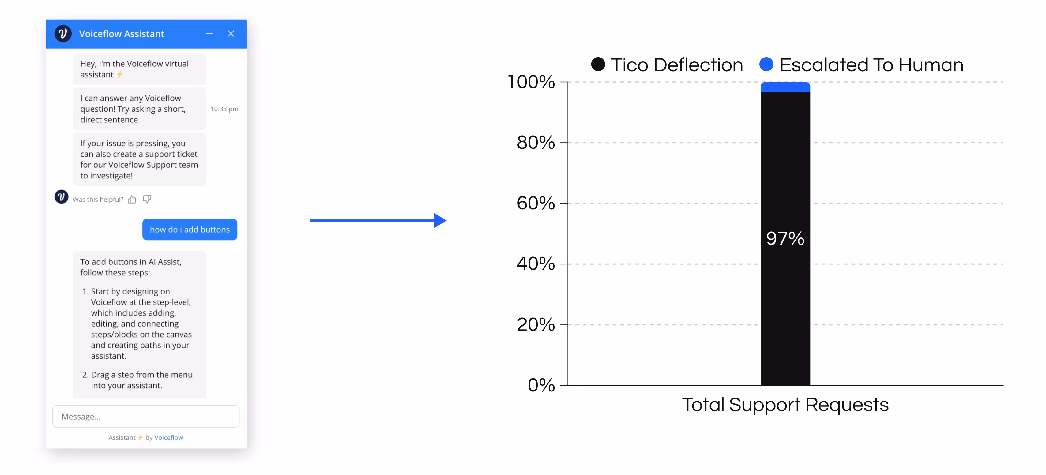- Integrated seamlessly with existing systems: The team opted to integrate Tico with Voiceflow’s support system, providing users with instant access to help without disrupting users’ workflow.