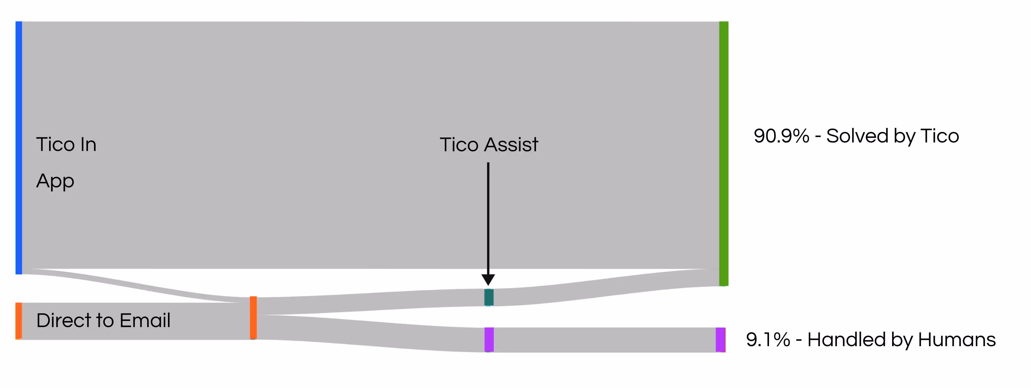 Tico resolved a staggering 90.9% of support tickets, highlighting its effectiveness in managing queries. This shift has profoundly reduced the volume of tickets requiring human intervention—down to a mere 9.1%—allowing the human support team to focus on complex issues that require a personal touch.