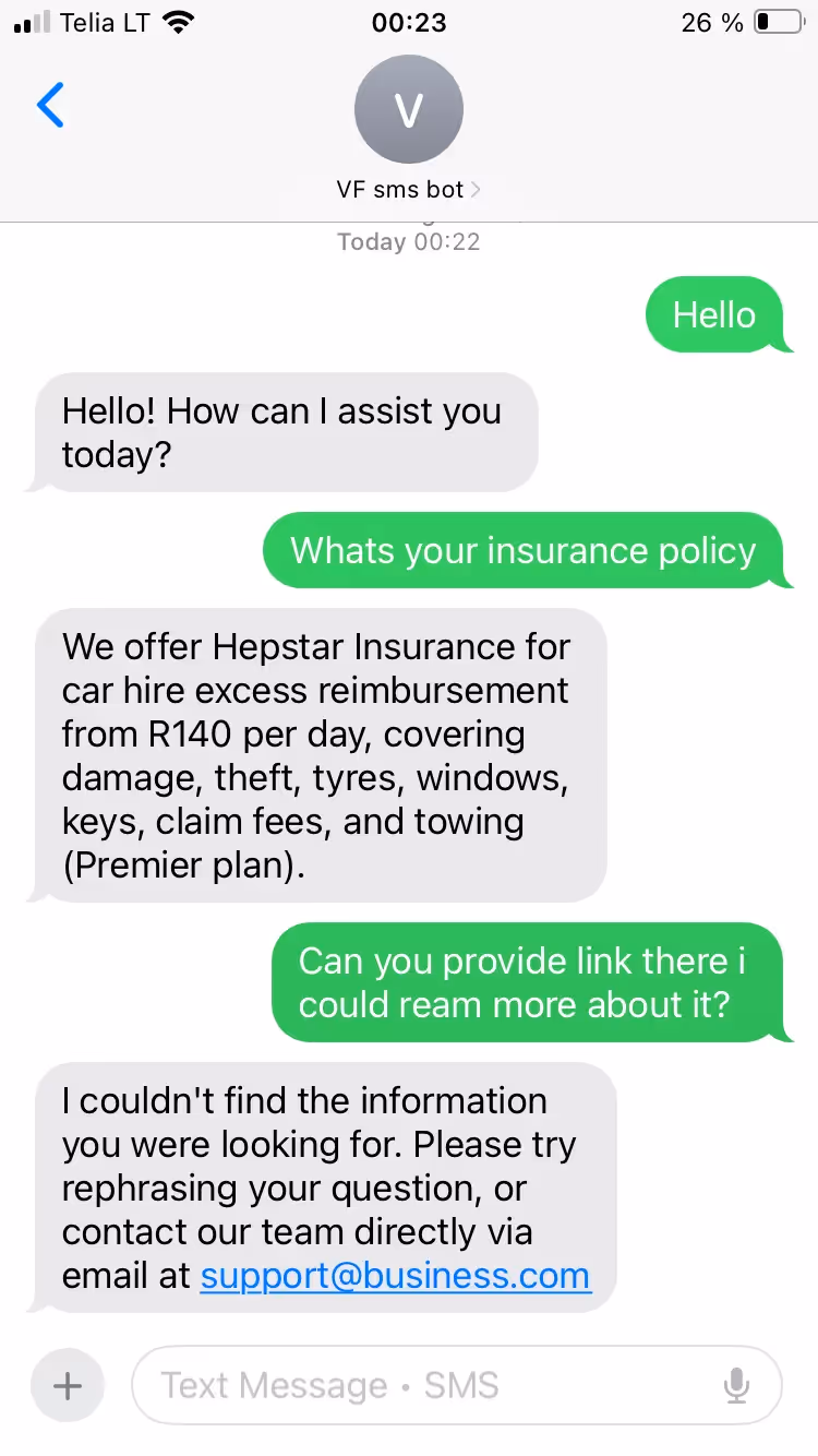 Here is how my interaction looked like from SMS (Image 6). You can see that one question failed to answer - that's completely fine. We might need to add more sources to the knowledge base or adjust the prompt. That's an expected and normal part of building out any kind of AI agent.