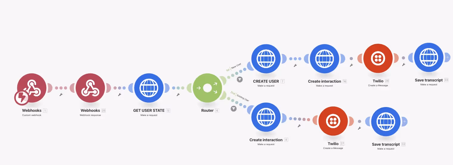 - From there, your Make scenario can take over - passing the message to Voiceflow, handling logic, and sending replies back via Twilio.