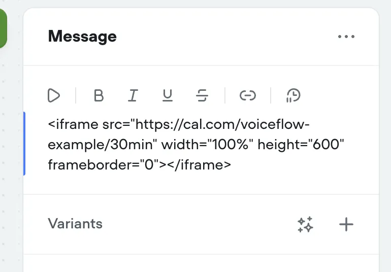 In Voiceflow, you can embed the Cal.com booking widget directly using a Text block (Image - 6) with HTML content: