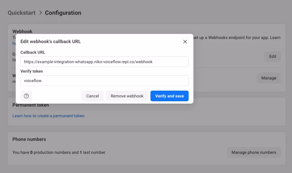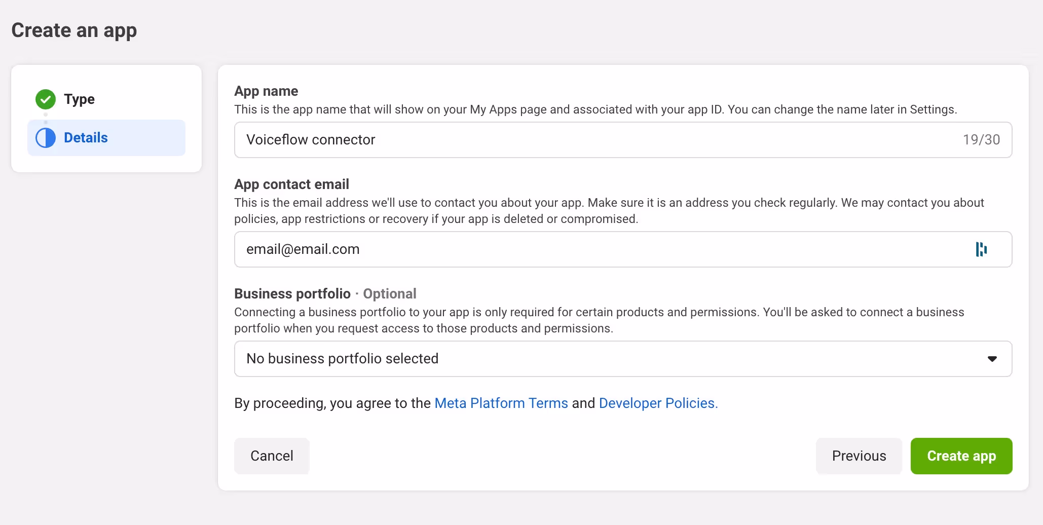 - Give your app a name like “Voiceflow to WhatsApp”.