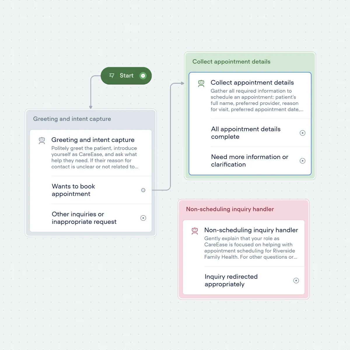 Design flows that check availability, confirm details, handle service types, or trigger follow-ups—all using a drag-and-drop interface.