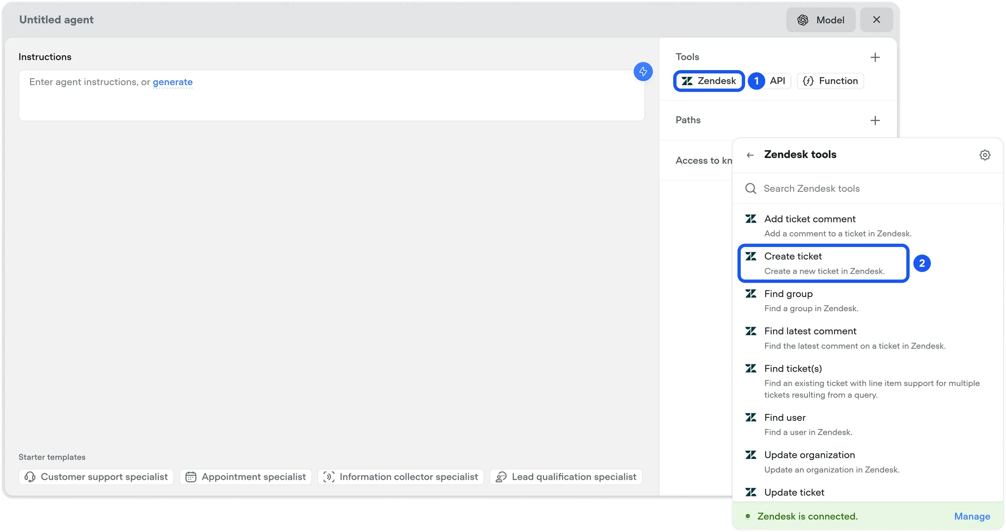 Now your AI agent is connected to Zendesk, it's time to give it the ability to do actions. In this lesson, we'll show you how to create a ticket, but what you learn is applicable to any of the supported actions.