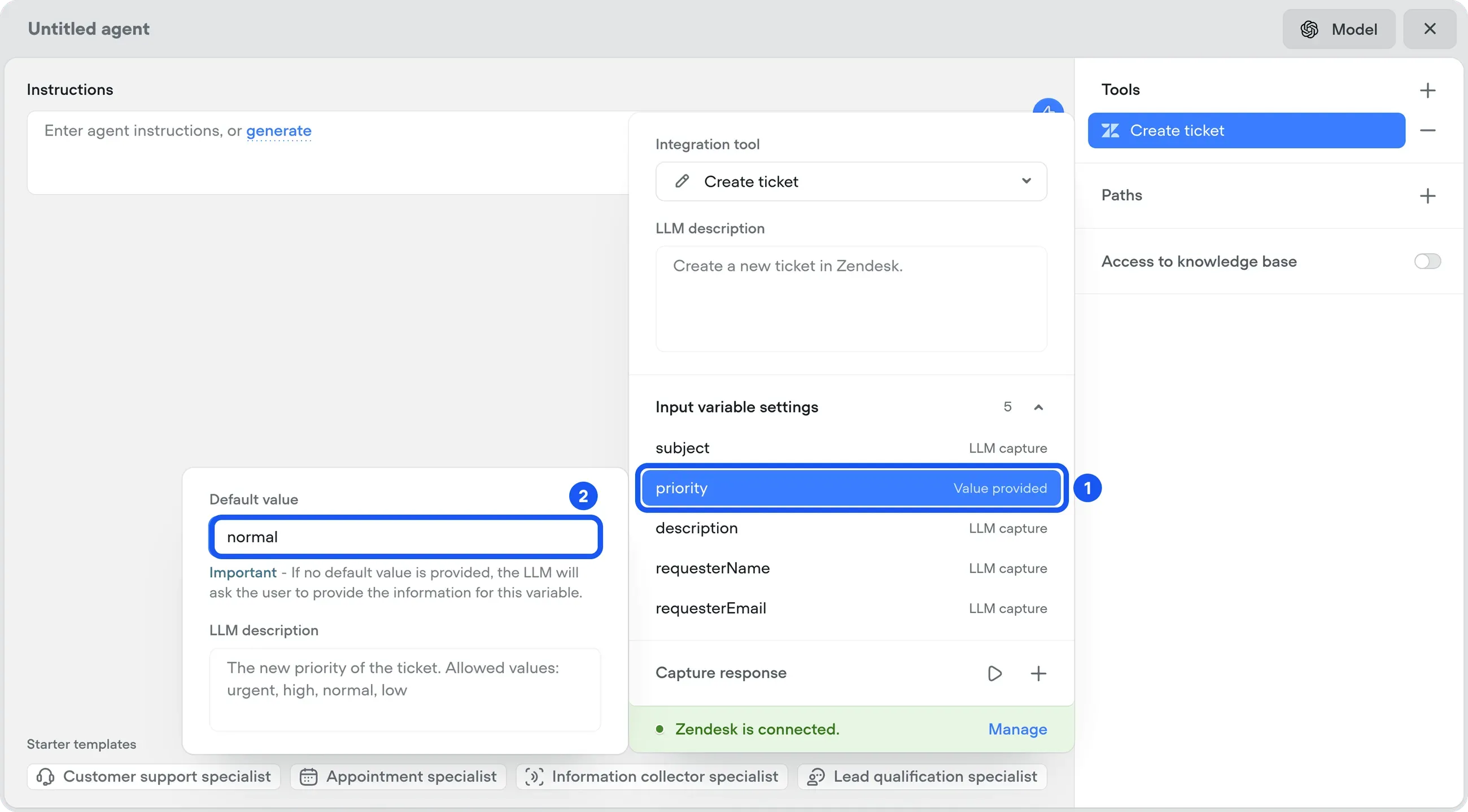 By default, our agent will automatically ask for all the required variables. For the Create ticket tool, these are subject, priority, description, requesterName, and requesterEmail. While it makes sense to ask for user for things like their name, it makes less sense to ask them for their priority - many users will consider everything urgent! Therefore, let's set the priority to always have the value of normal.