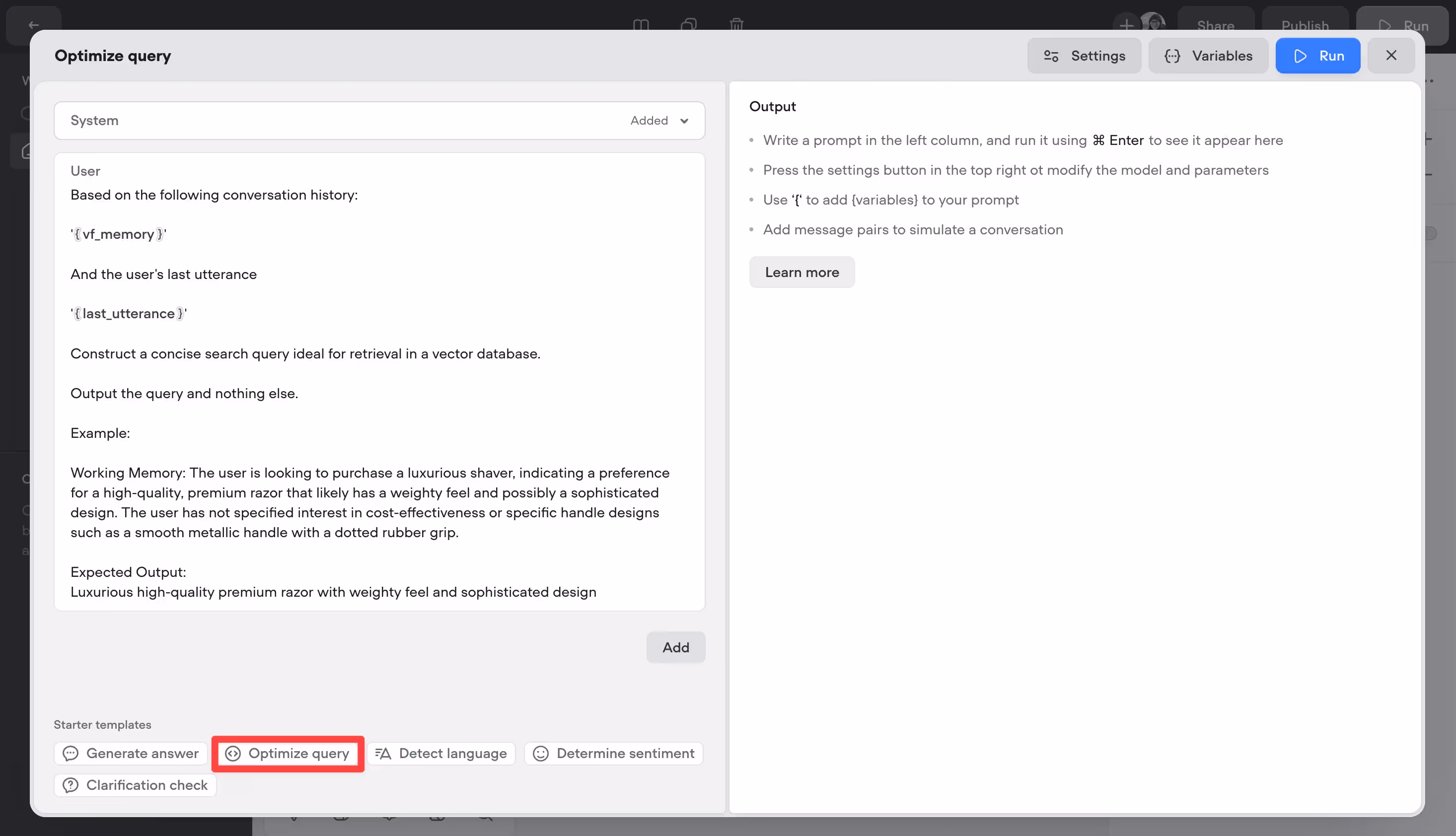 Rather conveniently, we can use the Optimize query template to optimize the user's query. This prompt is designed to simplify a full-message query down into something more searchable. For example, it'll turn "Hello, I'm a first time homebuyer and want to understand the best neighbourhoods to purchase a condo in!" into "Best neighborhoods for first-time homebuyers to purchase a condo".