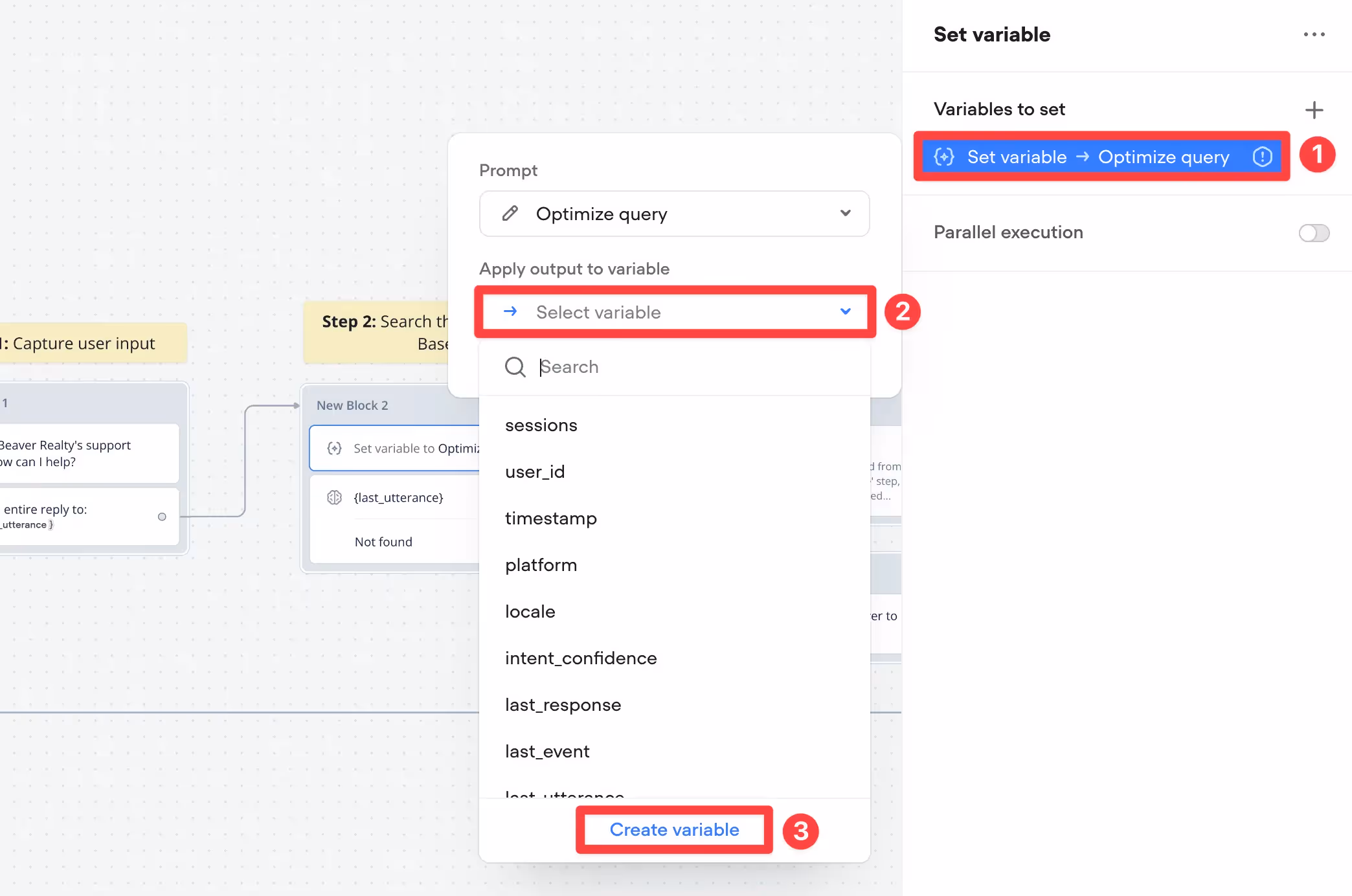 Now our prompt is selected, we need to choose a variable to save it to. Close the prompt window, then click back onto the variable. Then choose Select variable and create a new variable.