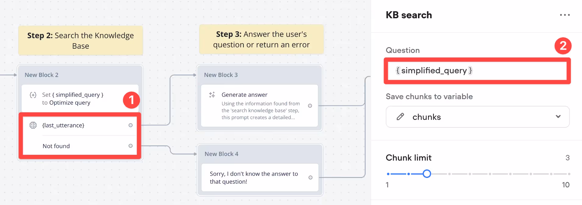 Click on your KB Search step and change Question option to use the simplified_query variable we just created.