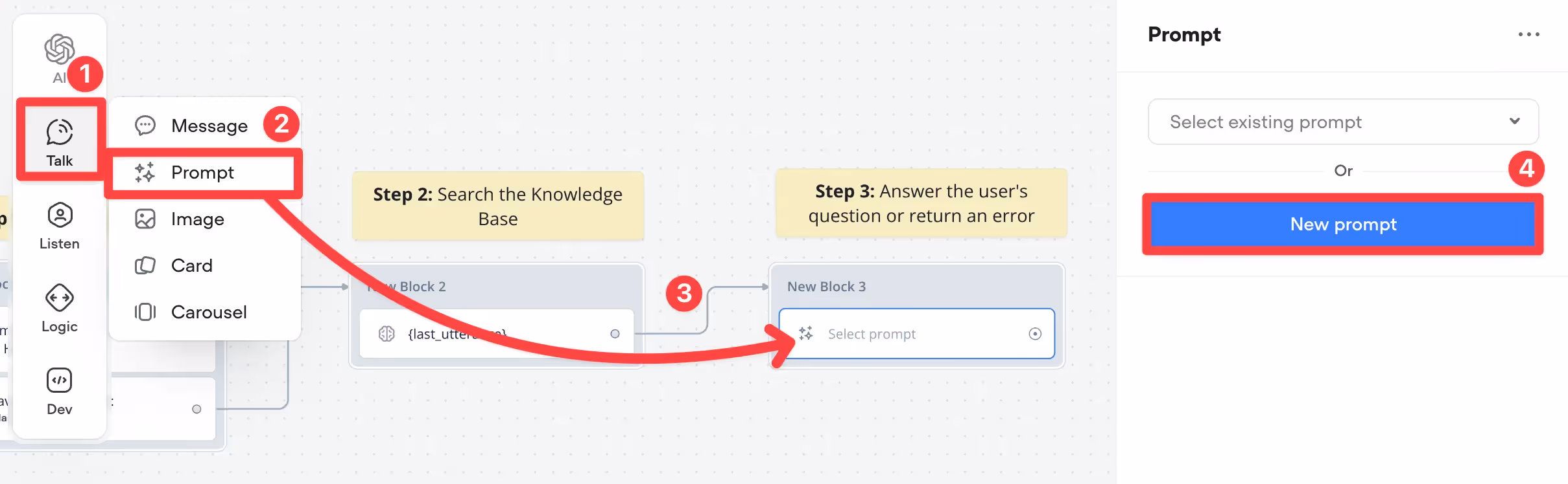 As the KB Search step returns raw chunks of information rather than a fully-written answer to the user's question, we should use the prompt step to write a human-understandable response to the query. Add one to your canvas, connect it to the previous step, then click New prompt.