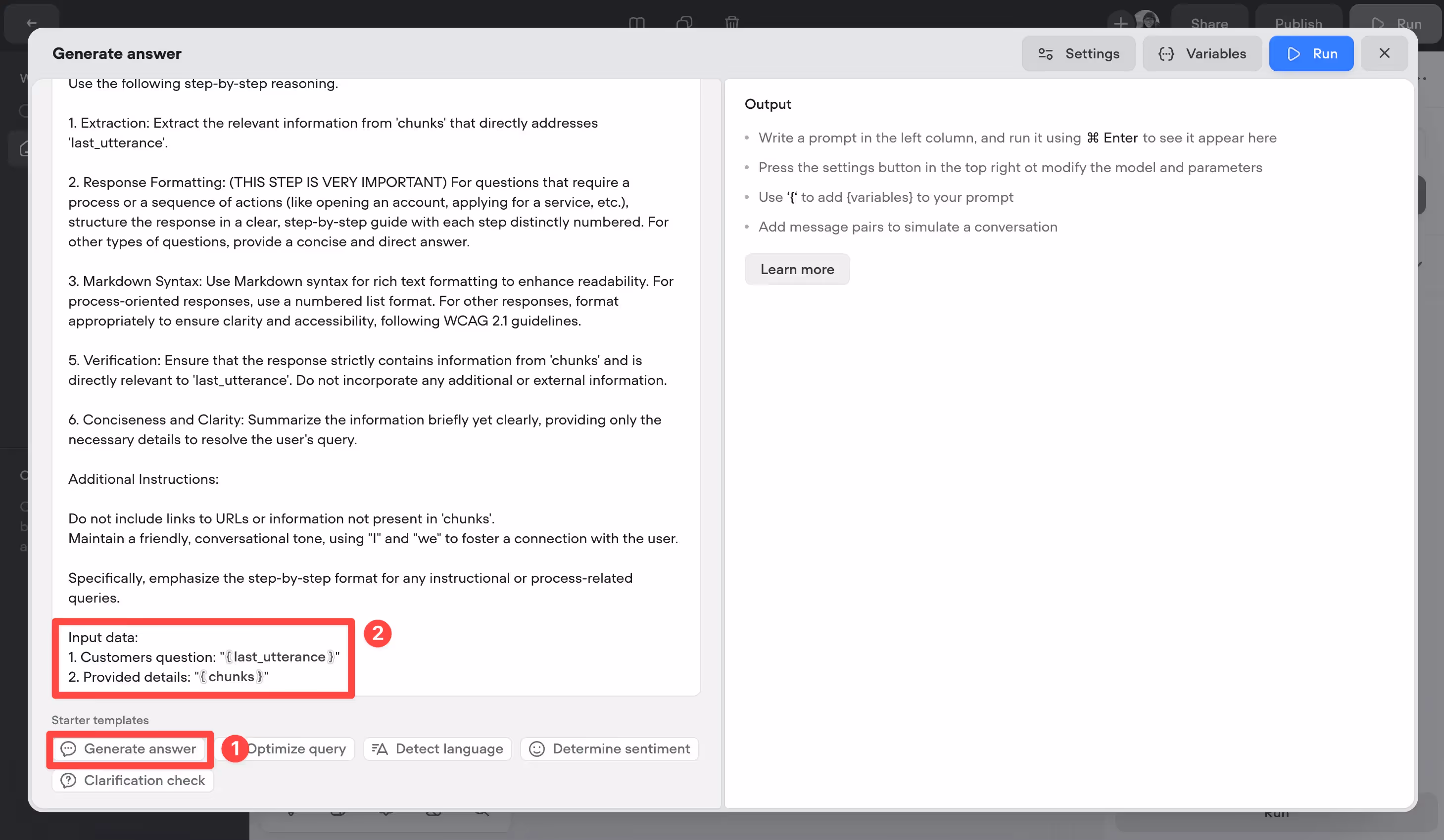 To make life easy, we've made a Generate answer prompt template, so give it a click. You'll also want to make sure that the {last_utterance} and {chunks} variables are correctly linked, as shown in the screenshot below.
