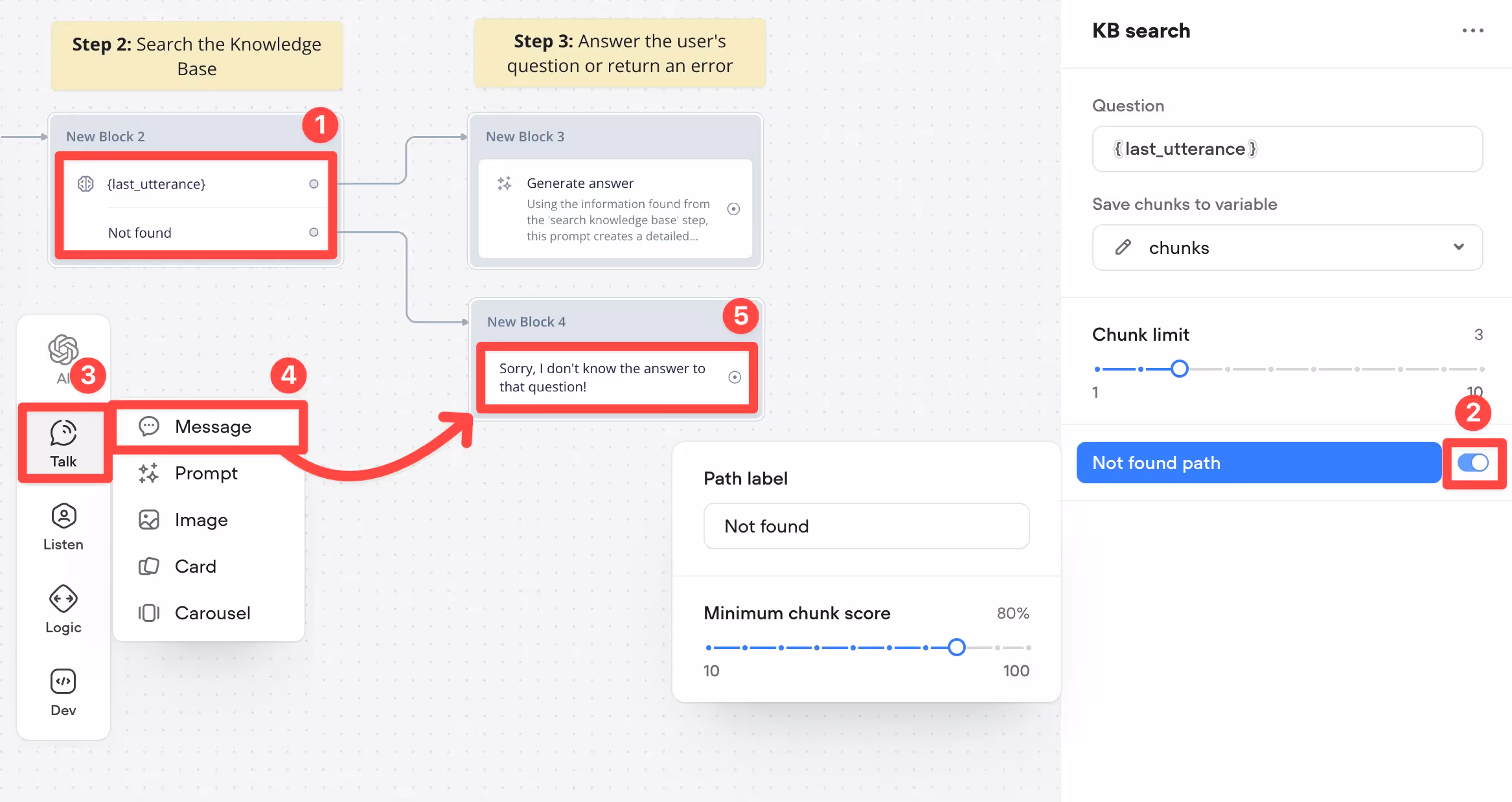 We can use the KB Search step to query our agent’s Knowledge Base. Add it to the canvas (it’s under the Dev menu in the sidebar), and connect it to the previous block. Then, set the Question to {last_utterance} and save chunks to the chunks variable.