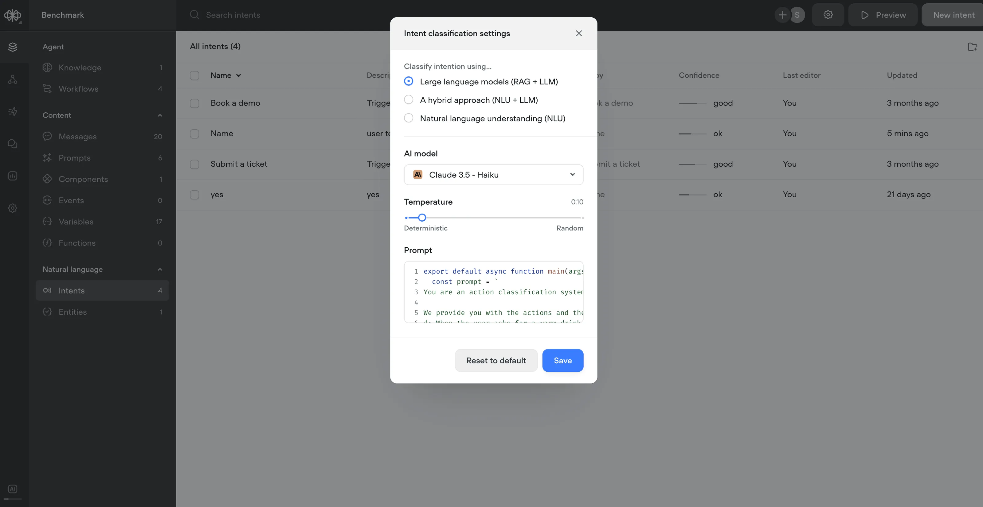To make this transition smoother, we will keep both services running for a period of time. This will give you the necessary opportunity to explore the new system, test it thoroughly, and make any adjustments to your agents as needed. You can switch between the NLU and RAG systems in intent classification settings within the Intents CMS.