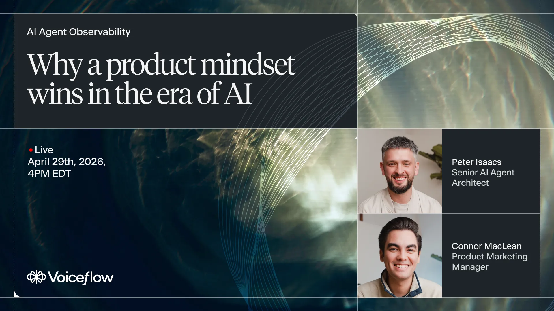 On April 29th, you can dive deeper into the the world of AI agent observability with Peter Isaacs. Register for our webinar, Why a product mindset wins in the era of AI, and you'll hear from AI agent experts and Voiceflow customers on how they launch, iterate, and scale their AI agents using Voiceflow's Observability Suite.